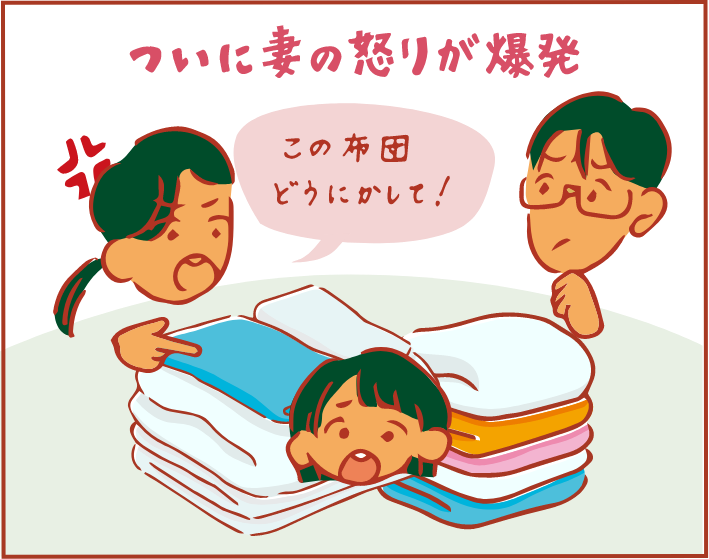 そんなある日、布団が山積みで足の踏み場もない自宅の部屋で、2歳の娘が行方不明に!大慌てで探したところ、幸い娘は積み上げられた布団の隅で無事でしたが、妻の怒りは大爆発!!!「お父さん、この布団どうにかして!!!」…このことがきっかけで、布団を小さくする圧縮袋の開発がスタートしました。